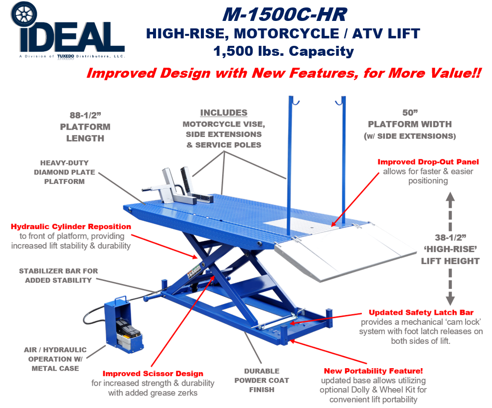 Introducing the M-1500C-HR High Rise Motorcycle Lift, the ultimate solution for all your motorcycle, ATV, and snowmobile maintenance needs. With a robust lifting capacity of 1,500 pounds, this versatile lift is designed to handle a wide range of vehicles, providing you with the convenience and efficiency you need in your garage or workshop.